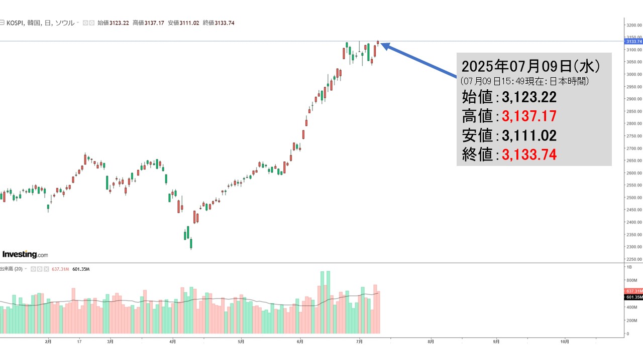 2025年07月09日(水)の韓国株式市場が締まりました。15:49現在、KOSPI(韓国総合株価指数)のチャートは以下のようになっています(チャートは『Investing.com』より引用)。