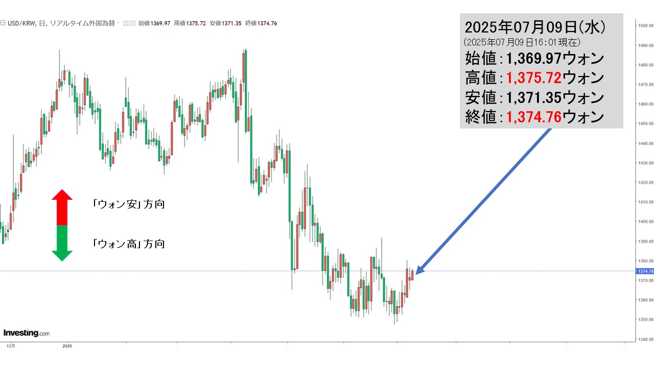 2025年07月09日(火)16:01現在、ドルウォンのチャートは以下のようになっています(チャートは『Investing.com』より引用)。