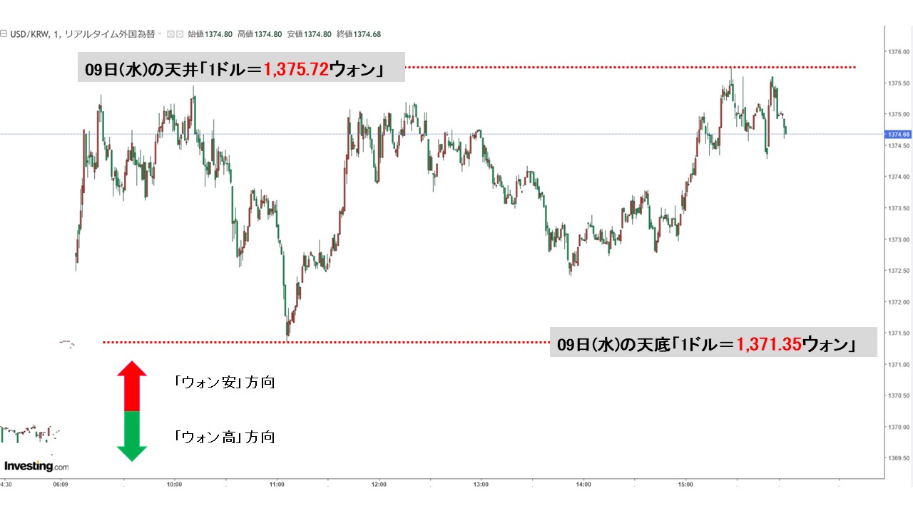 現在のところ「1ドル=1,374ウォン」近辺の攻防となっています。