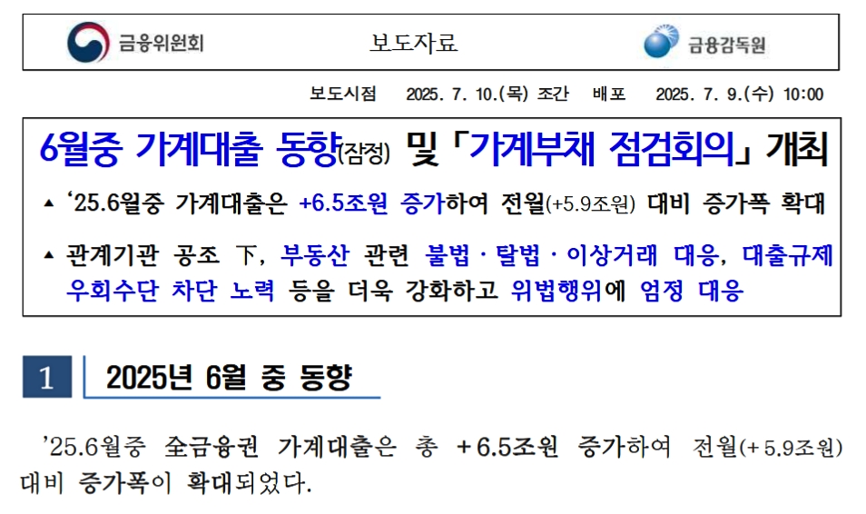 2025年07月09日、金融監督院(および金融委員会)が「06月中の家計貸出動向(暫定)および家計負債点検会議」を開催。以下がそのプレスリリースですが――。