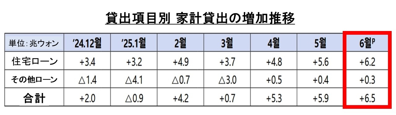 2025年6月中、全金融圏の家計貸し出しは総計+6.5兆ウォン増加し、前月(+5.9兆ウォン)に比べて増加幅が拡大した。