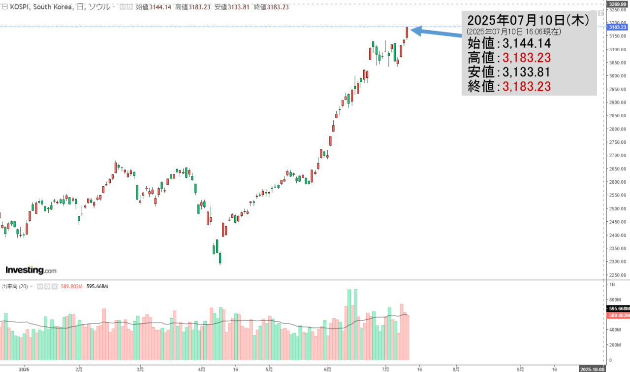 2025年07月11日(金)の韓国株式市場が開きましたので、KOSPIチャートの初動状況を以下の記事にまとめました。本記事と併せてお読み頂ければ幸いです。