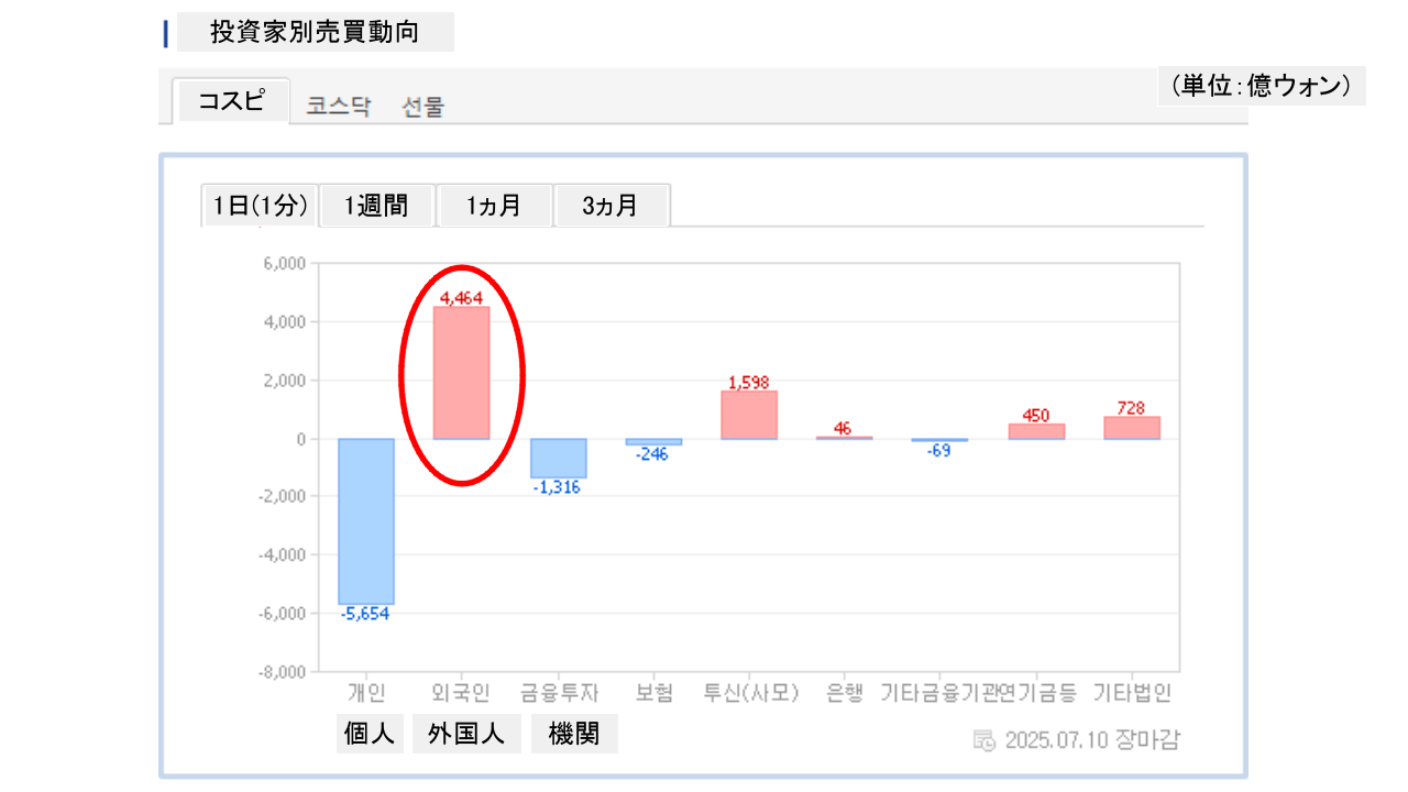 個人投資家は「5,654億ウォン」の売り越し。一方の外国人投資家は「4,464億ウォン」の買い越しです。
