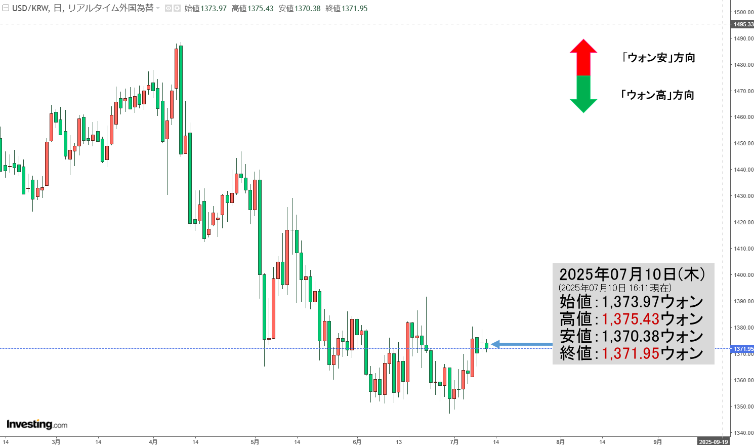 2025年07月11日(金)の市場が開きました。10:19現在、ドルウォンのチャートは以下のようになっています(チャートは『Investing.com』より引用)。陽線となっており、現在のところ「1ドル=1,374ウォン」近辺の攻防となって...