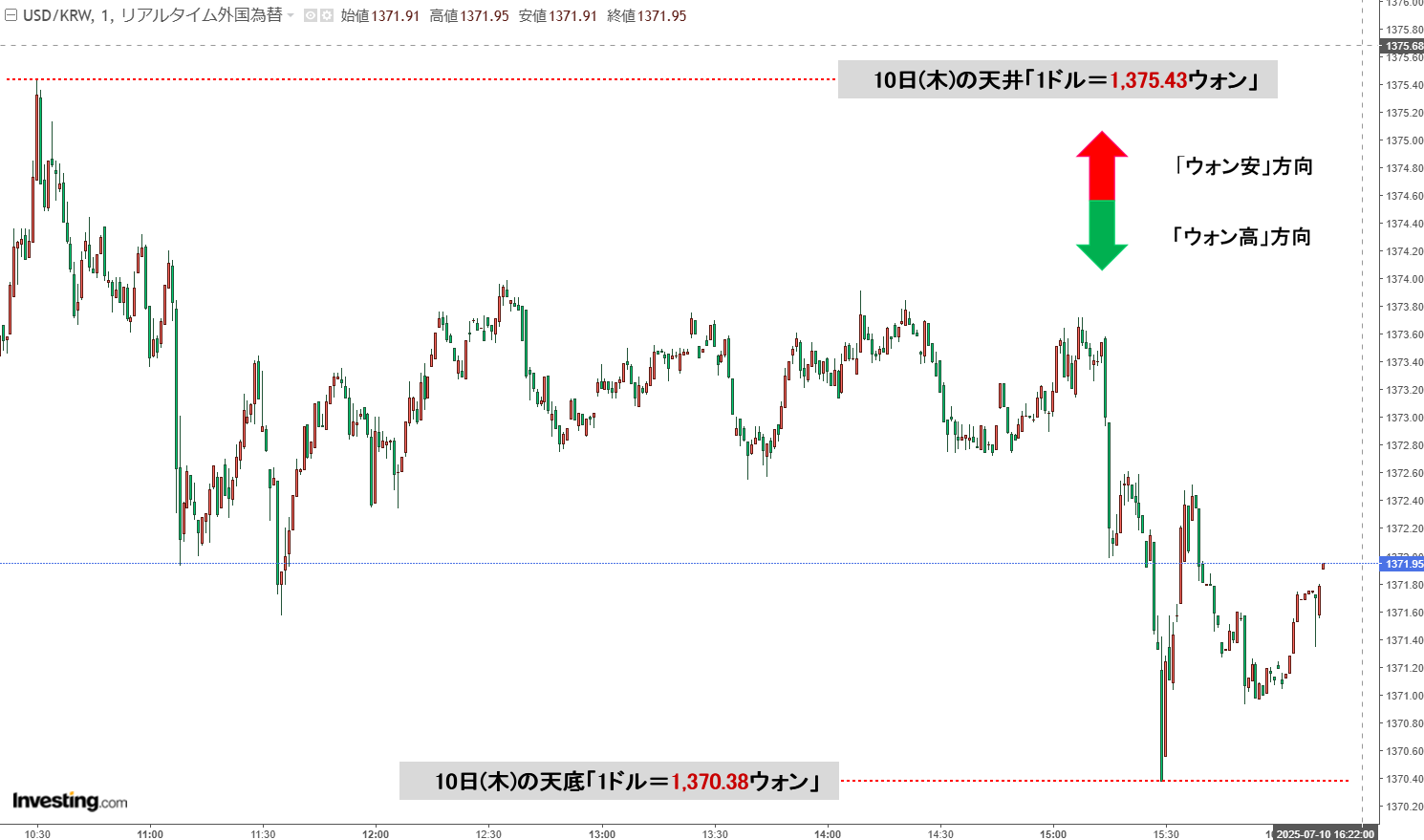 現在の天井は「1ドル=1,375.43ウォン」、天底は「1ドル=1,370.38ウォン」です。