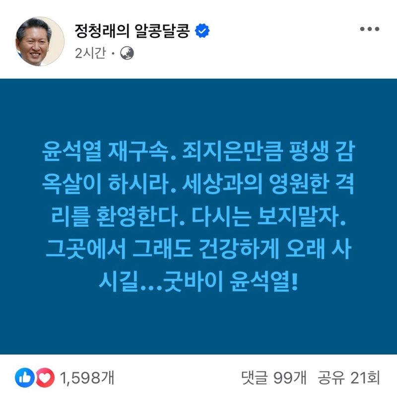 この鄭清来(チョン・チョンレ)さんは、尹錫悦(ユン・ソギョル)前大統領が収監されたことについて、喜々としてSNSに投稿を行いました。