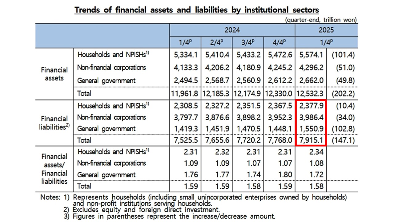 韓国の政府・企業・家計、三部門の負債合計は「7,915.1兆ウォン」もあるのです。