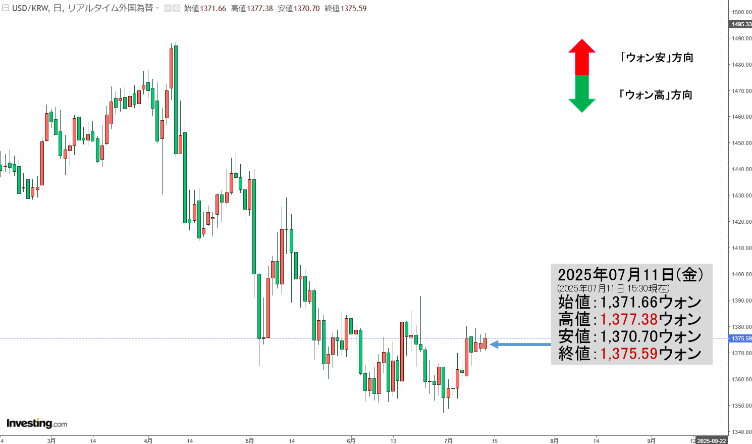 2025年07月11日(金)が(ほぼほぼ)締まりました。2025年07月12日 06:01現在、ドルウォンチャートは以下のようになっています(チャートは『Investing.com』より引用:以下同)。なんとか陽線で終わりました。「1ドル=...