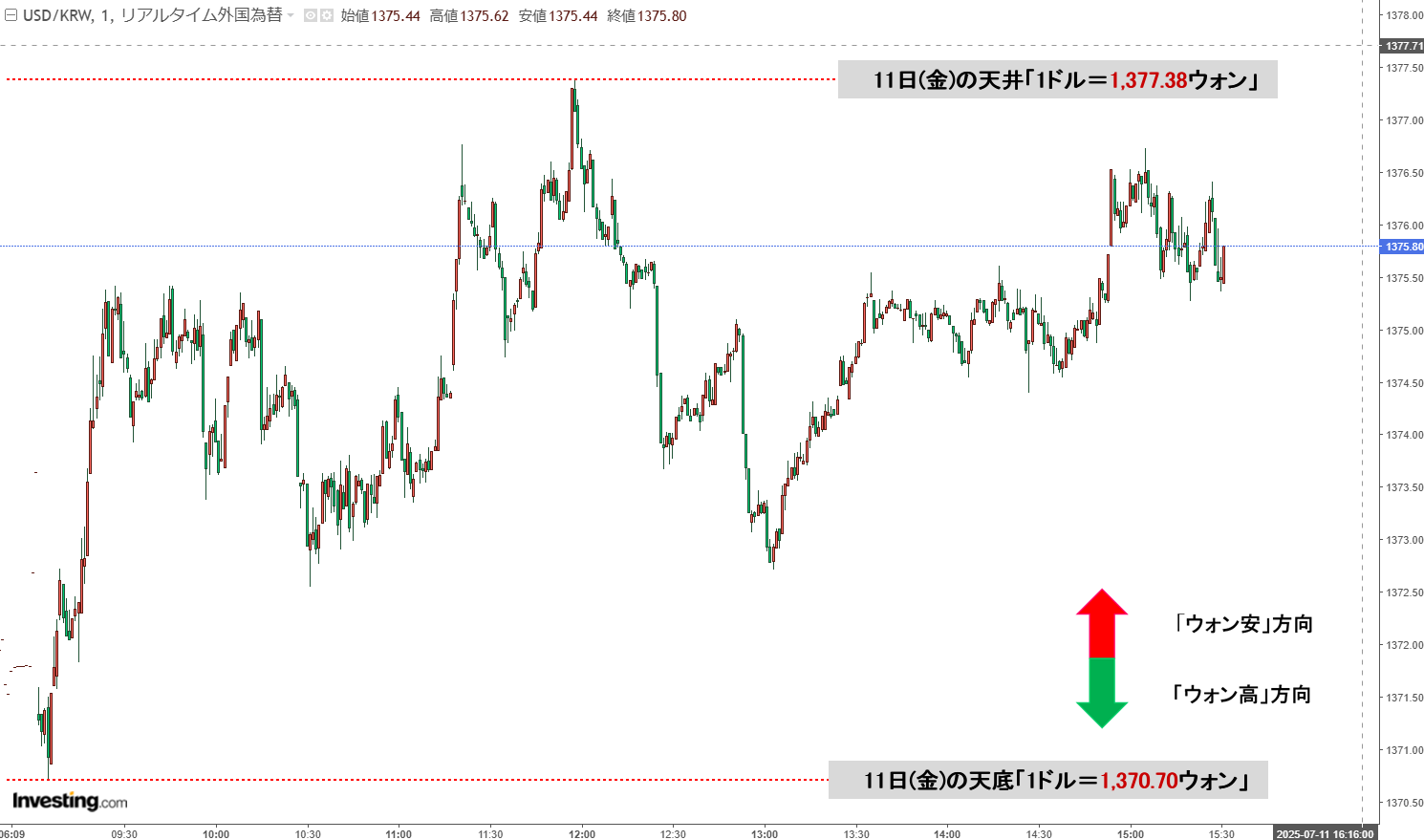 2025年07月11日(金)が(ほぼほぼ)締まりました。2025年07月12日 05:40現在、ドルウォンチャートは以下のようになっています(チャートは『Investing.com』より引用:以下同)。ローソク足1本が1分間の値動きを示す「…