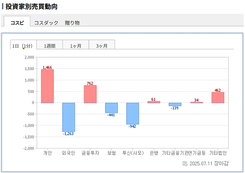 個人投資家は「1,466億ウォン」の買い越し。一方の外国人投資家は「1,263億ウォン」の売り越しです。