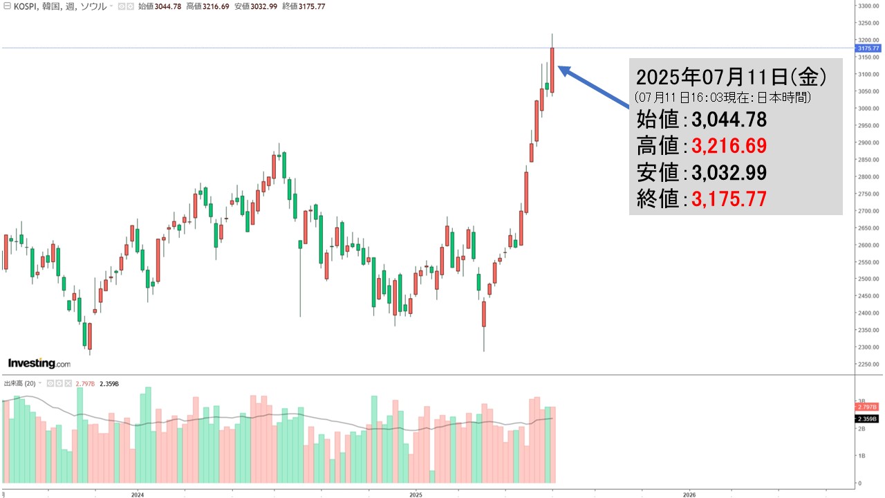 2025年07月11日(金)の韓国株式市場が締まりました。16:06現在、KOSPI(韓国総合株価指数)のチャートは以下のようになっています(チャートは『Investing.com』より引用)。