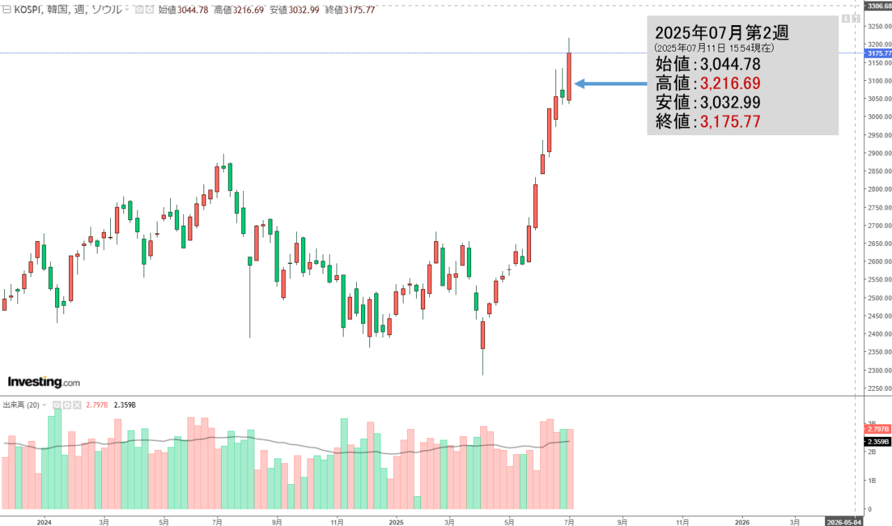 Money1では連日ご紹介していますが、KOSPI(韓国総合株価指数)は急上昇を続けています。2025年07月11日時点では以下のようになっています(チャートは『Investing.com』より引用/週足)。