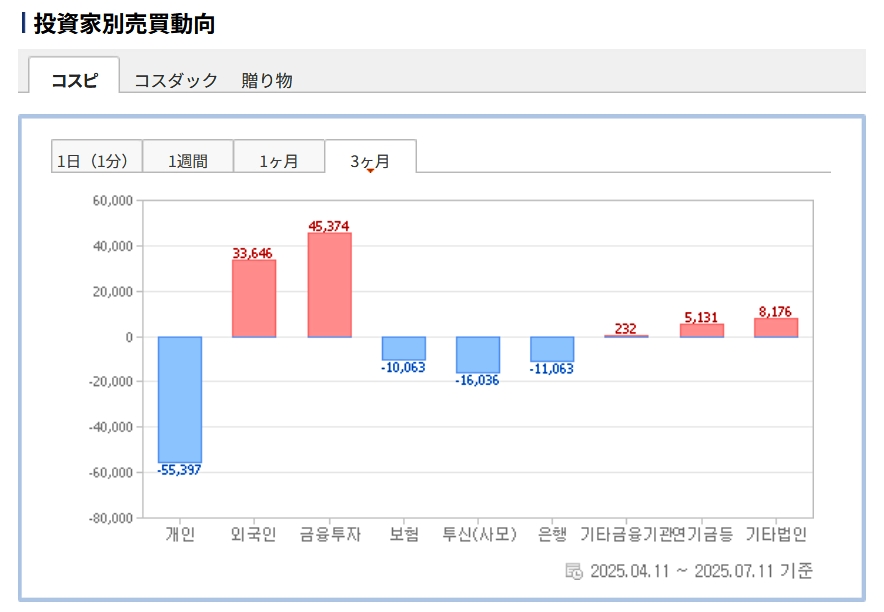 韓国株式市場に外国人投資家の資金は流入してます。以下は直近3カ月のKOSPIにおけるプレーヤー別の動向です。