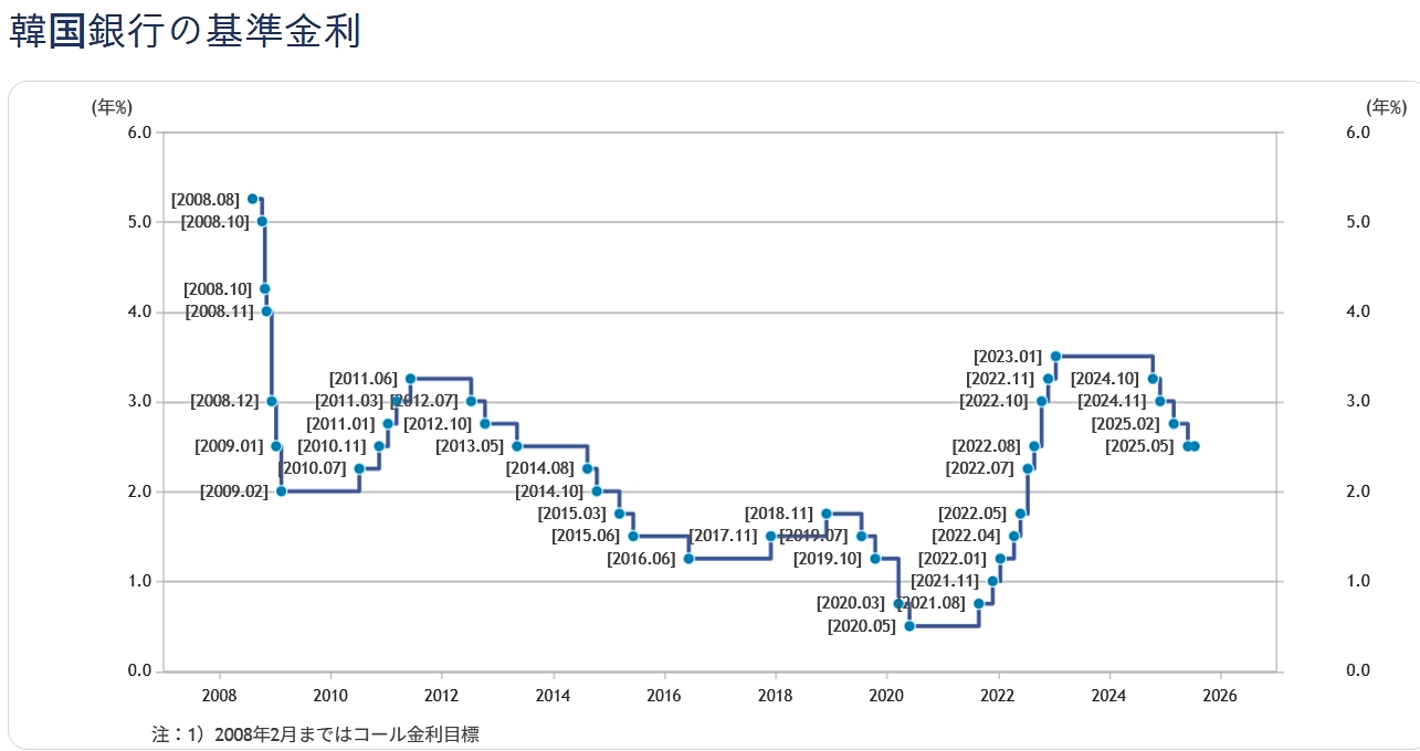 2025年07月10日、韓国の金融通貨委員会は基準金利を「2.50%」に据え置きました。