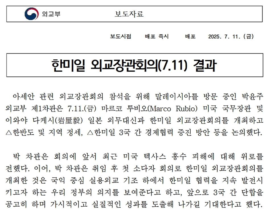 2025年07月11日、韓国の外交部は日米韓の外務大臣会議が行われました。