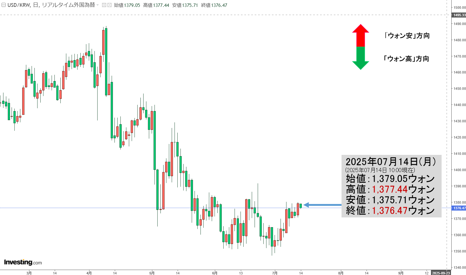 2025年07月14日(月)の市場が開きました。10:00現在、ドルウォンのチャートは以下のようになっています(チャートは『Investing.com』より引用)。