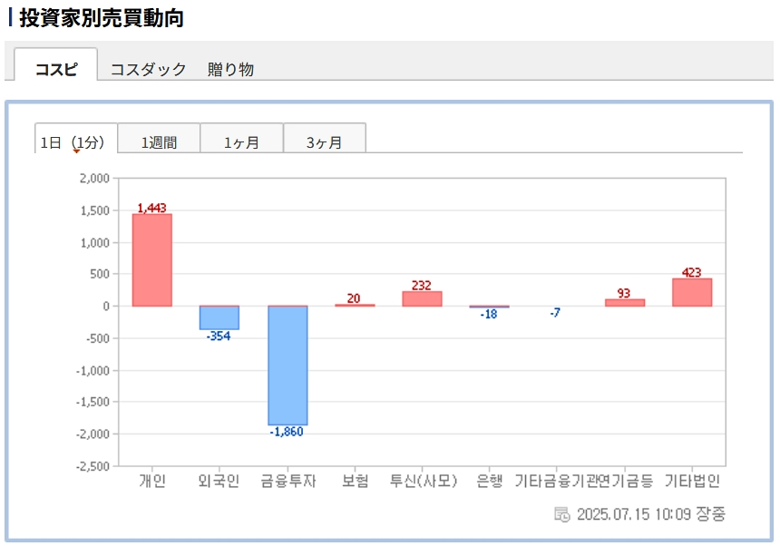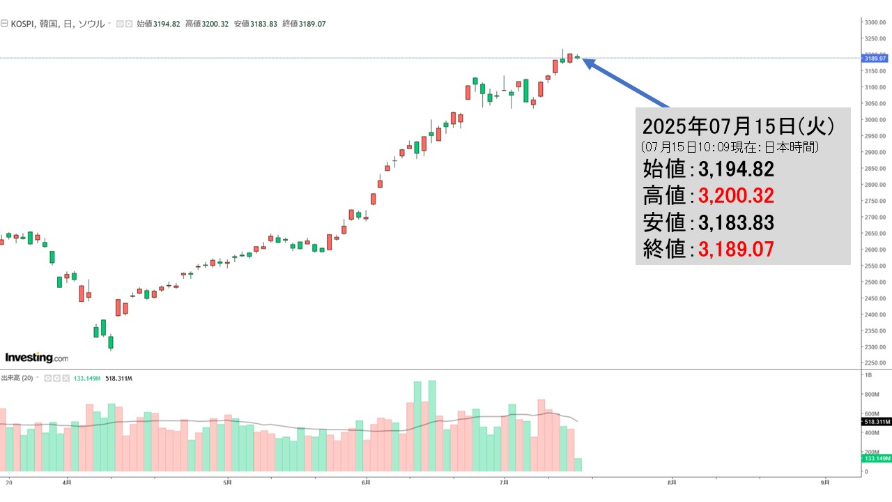2025年07月15日(火)の韓国株式市場が開きました。10:09現在、KOSPI(韓国総合株価指数)のチャートは以下のようになっています(チャートは『Investing.com』より引用)。