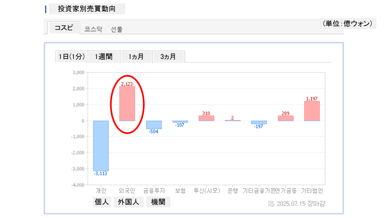 個人投資家は「3,113億ウォン」の売り越し。一方の外国人投資家は「2,123億ウォン」の買い越しです。