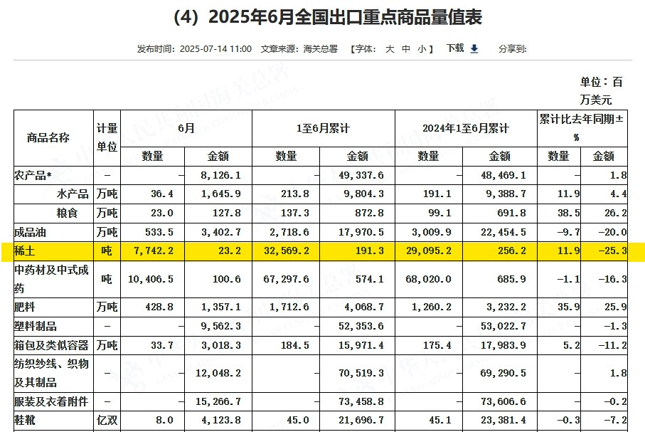2025年07月14日、中国の税関総署が「(4)2025年6月時点の主要輸出品目の数量・金額表」を公表したのですが、非常に興味深い数字があります。