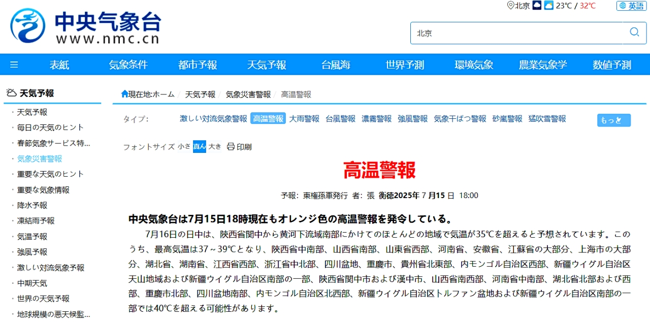 2025年07月15日18時中央気象台は07月15日18時に高温橙色警報を引き続き発表した。