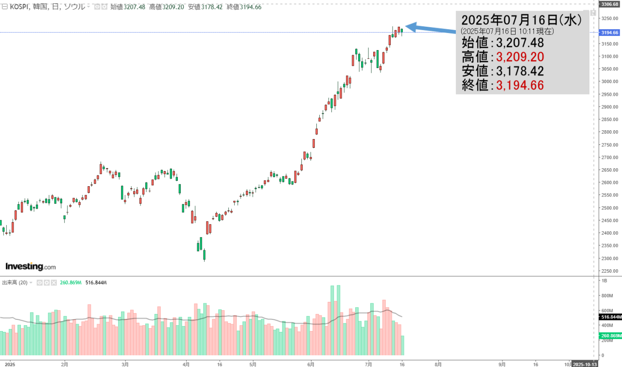 「韓国株式市場」07月16日(水)初動・KOSPI「3,194」3,200割れ。