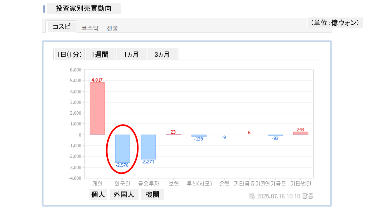 個人投資家は「4,817億ウォン」の買い越し。一方の外国人投資家は「2,578億ウォン」の売り越しです。