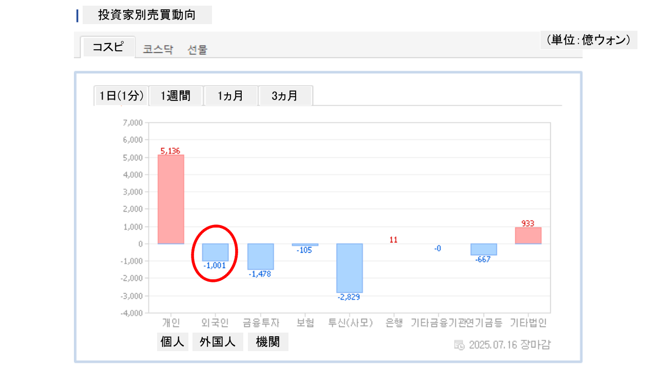 個人投資家は「5,136億ウォン」の買い越し。一方の外国人投資家は「1,001億ウォン」の売り越しです。
