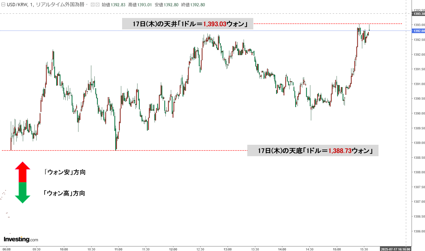 現在の天井は「1ドル=1,393.03ウォン」、天底は「1ドル=1,388.73ウォン」です。