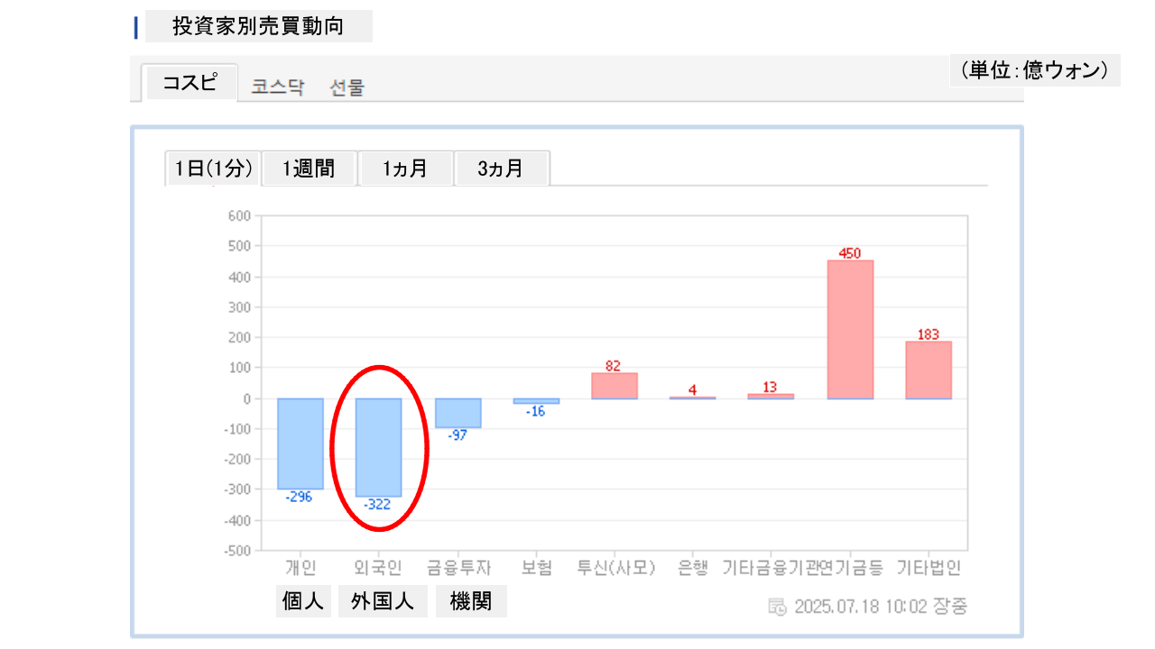 個人投資家は「296億ウォン」の売り越し。一方の外国人投資家は「322億ウォン」の売り越しです。