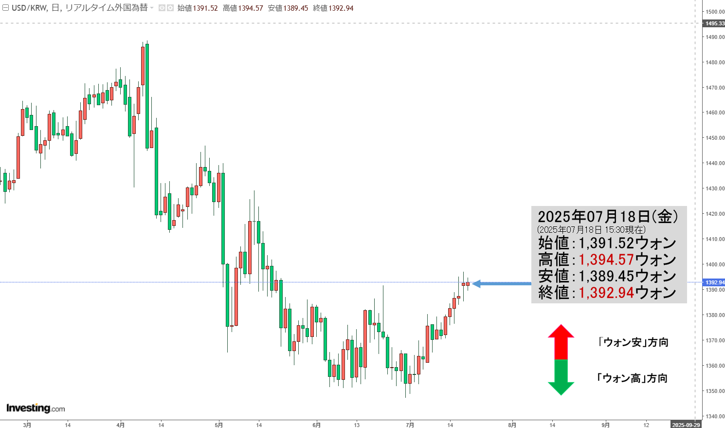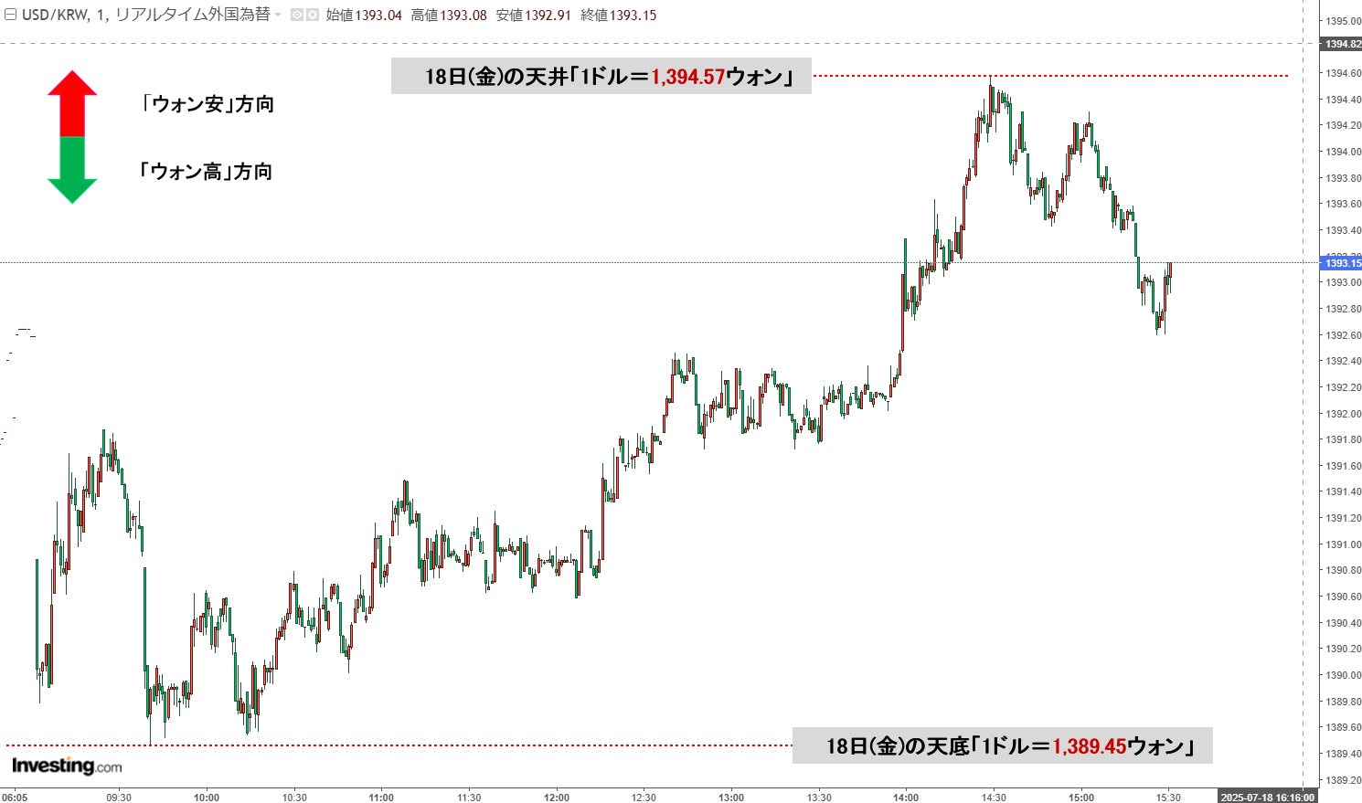 2025年07月18日(金)が(ほぼほぼ)締まりました。2025年07月19日 06:01現在、ドルウォンチャートは以下のようになっています(チャートは『Investing.com』より引用:以下同)。ローソク足1本が1分間の値動きを示す「…
