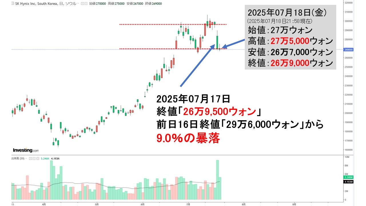 2025年07月17日、韓国『SKハイニックス』の株価が暴落しました。以下をご覧ください。