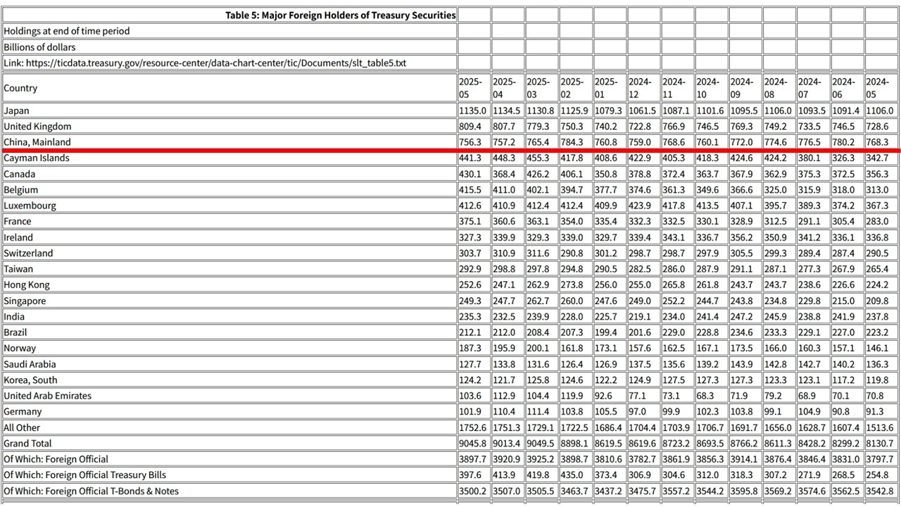 2025年07月17日、アメリカ合衆国の財務省が2025年05月時点での「合衆国公債の主要ホルダーの保有金額」を公表しました。