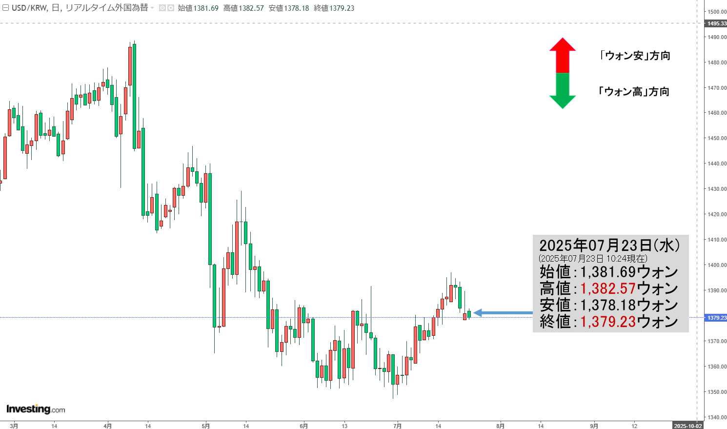 2025年07月23日(水)15:30現在、ドルウォンのチャートは以下のようになっています(チャートは『Investing.com』より引用)。「1ドル=1,380ウォン」を割りました。現在のところ「1ドル=1,379ウォン」近辺の攻防とな...