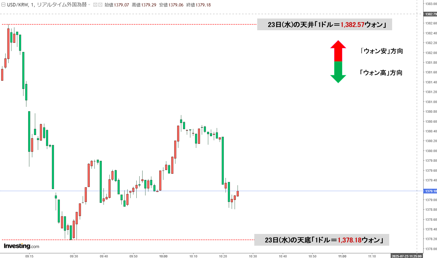 「ドルウォン」07月23日(水)初動・「1,379ウォン」上げ始まりで陰線。