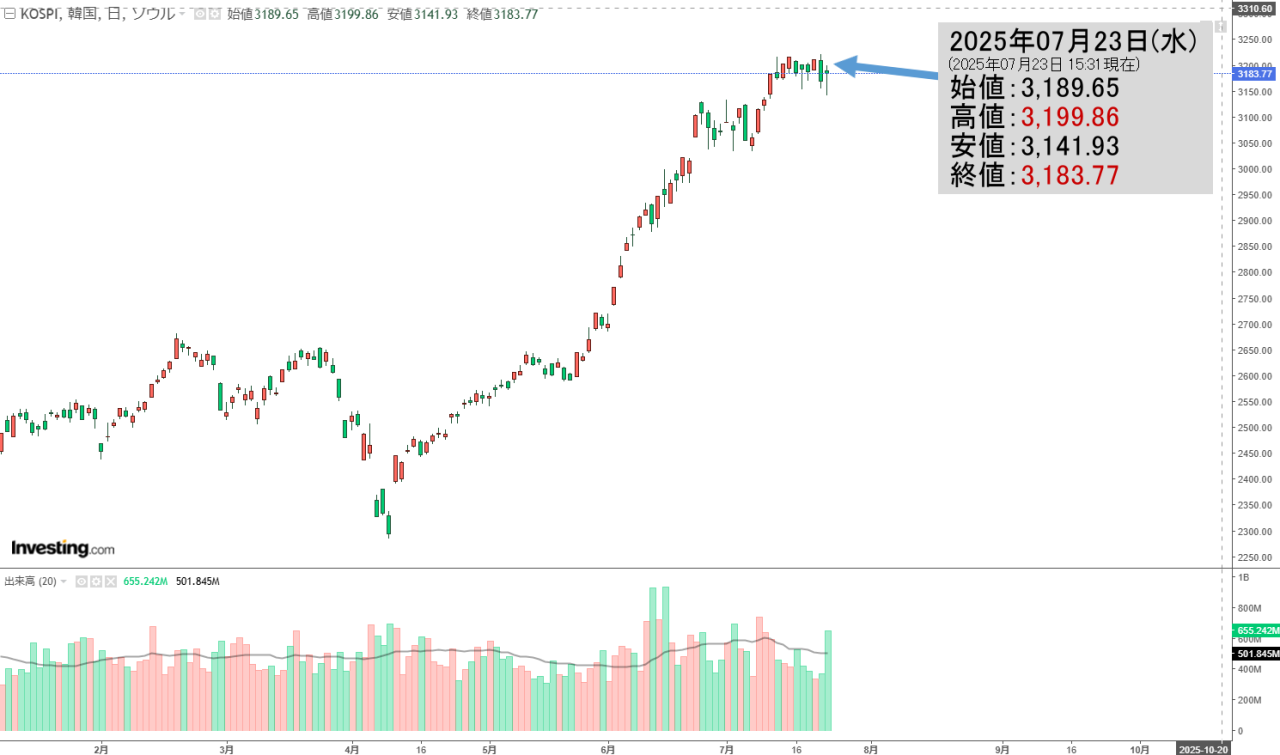 「韓国株式市場」07月24日(木)初動・KOSPI「3,214」ギャップアップ