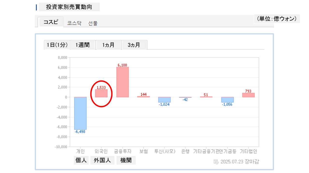 個人投資家は「6,498億ウォン」の売り越し。一方の外国人投資家は「1,533億ウォン」の買い越しです。