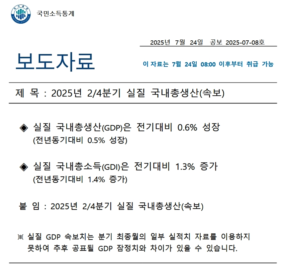 2025年07月24日、『韓国銀行』が2025年第2四半期の実質国内総生産(GDP)を発表しました。