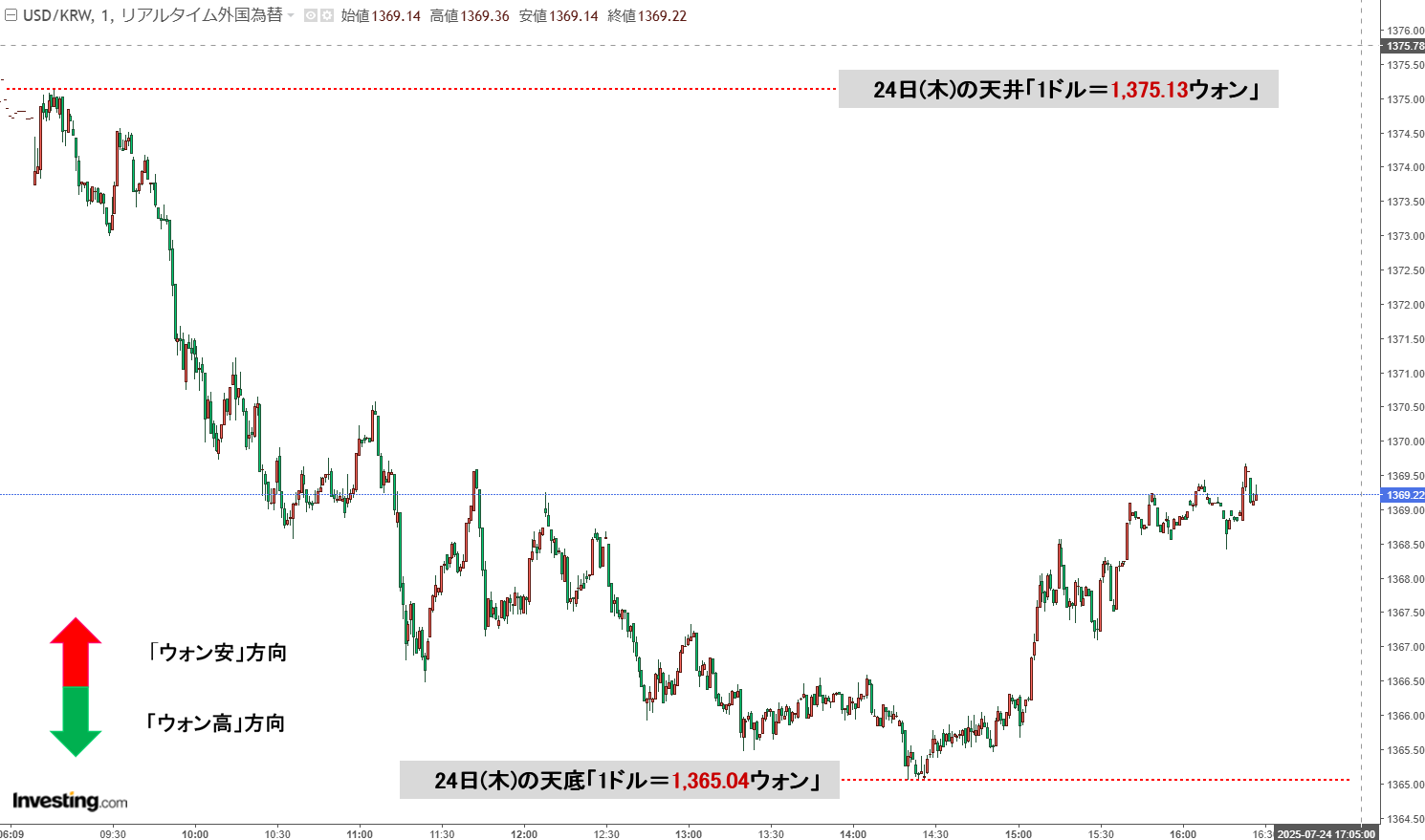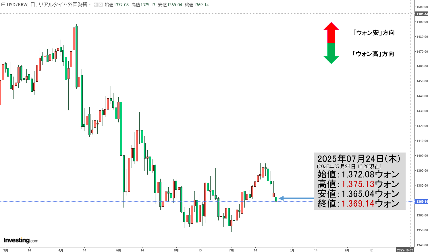 2025年07月24日(木)16:26現在、ドルウォンのチャートは以下のようになっています(チャートは『Investing.com』より引用)。