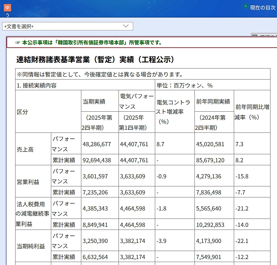 当期純利益:3兆2,530億9,800万ウォン(-22.1%)2025年累計