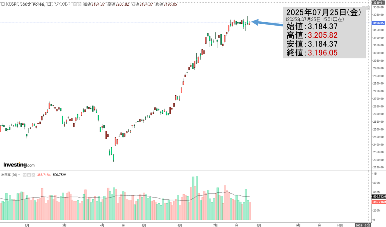 2025年07月28日(月)の韓国株式市場が開きました。10:02現在、KOSPI(韓国総合株価指数)のチャートは以下のようになっています(チャートは『Investing.com』より引用)。上げて始まりましたが現在のところ陰線。KOSPI...