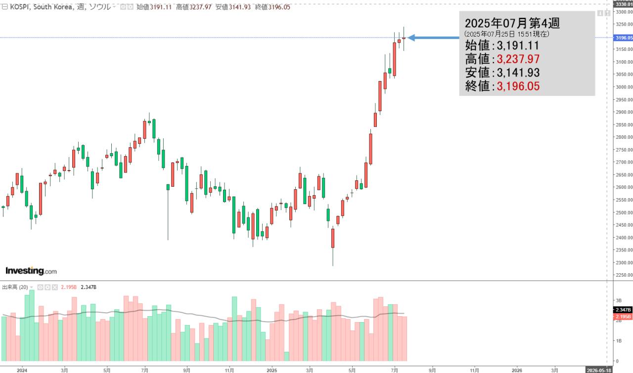 「韓国株式市場」07月28日(月)初動・KOSPI「3,202」上げ始まりで陰線。