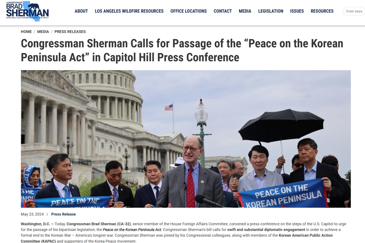 2024年5月23日|ワシントンD.C.本日、下院外交委員会の上級メンバーであるブラッド・シャーマン議員(カリフォルニア州第32選挙区)は、米国議会議事堂前で記者会見を開き、自身が提出した超党派法案「朝鮮半島平和法案(Peace on the Korean Peninsula Act:引用者注)」の可決を訴えた。