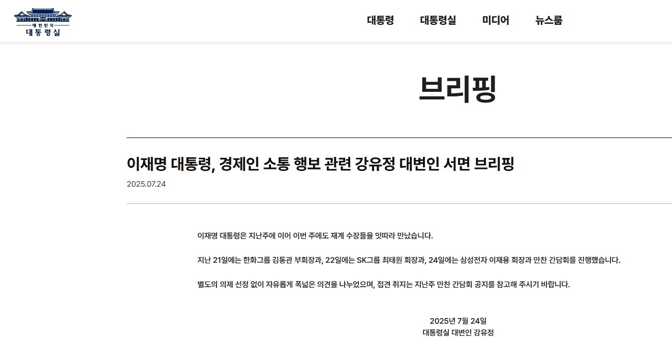 2025年07月24日、韓国の大統領室が以下のプレスリリースを出しました。