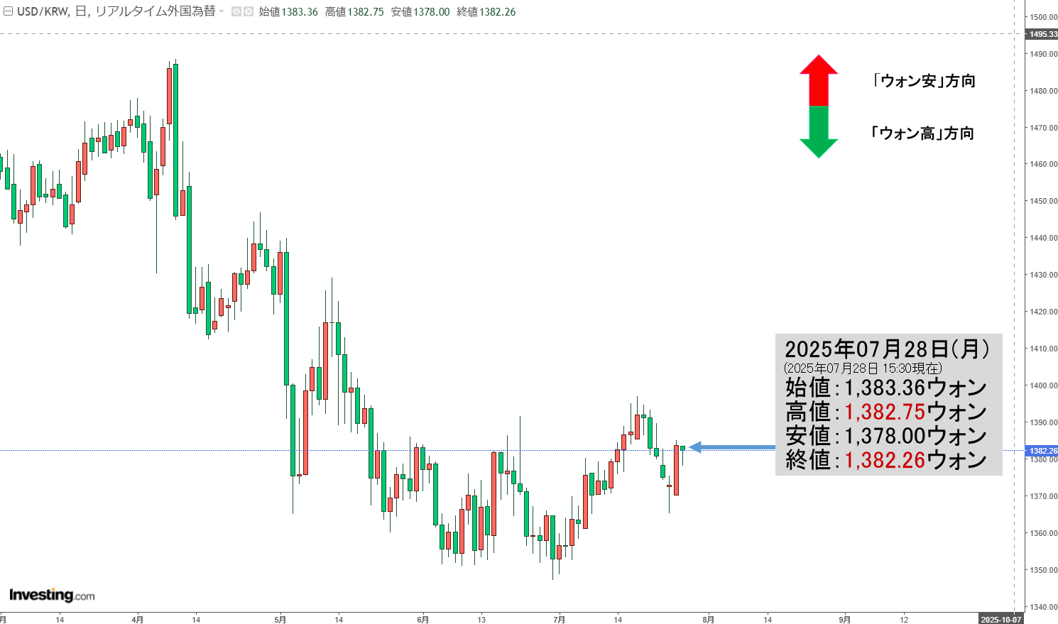 2025年07月28日(月)15:30現在、ドルウォンのチャートは以下のようになっています(チャートは『Investing.com』より引用)。