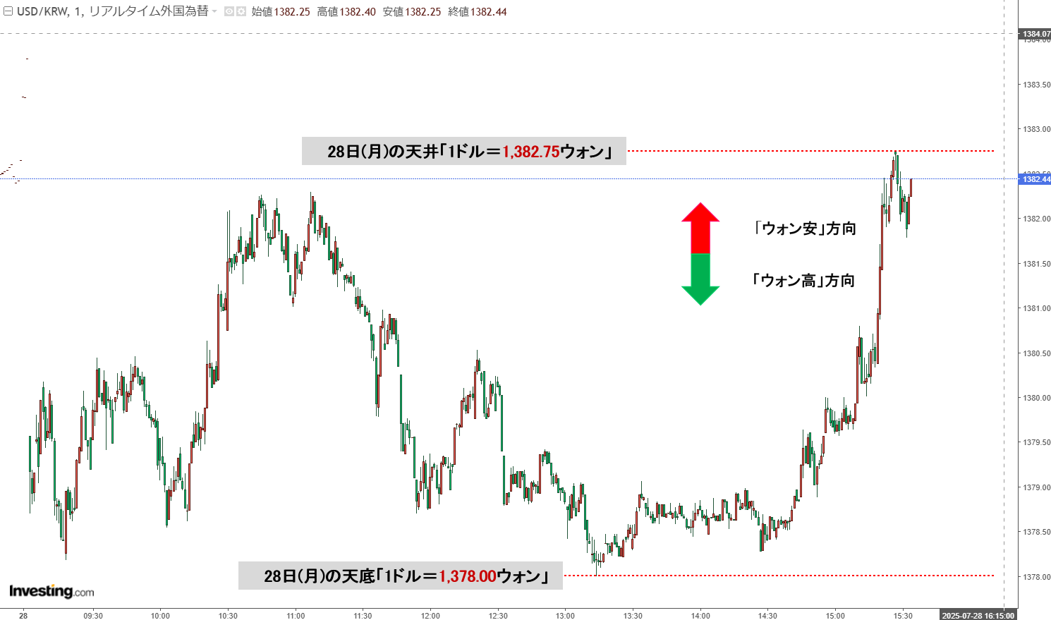 現在の天井は「1ドル=1,382.75ウォン」、天底は「1ドル=1,378.00ウォン」です。