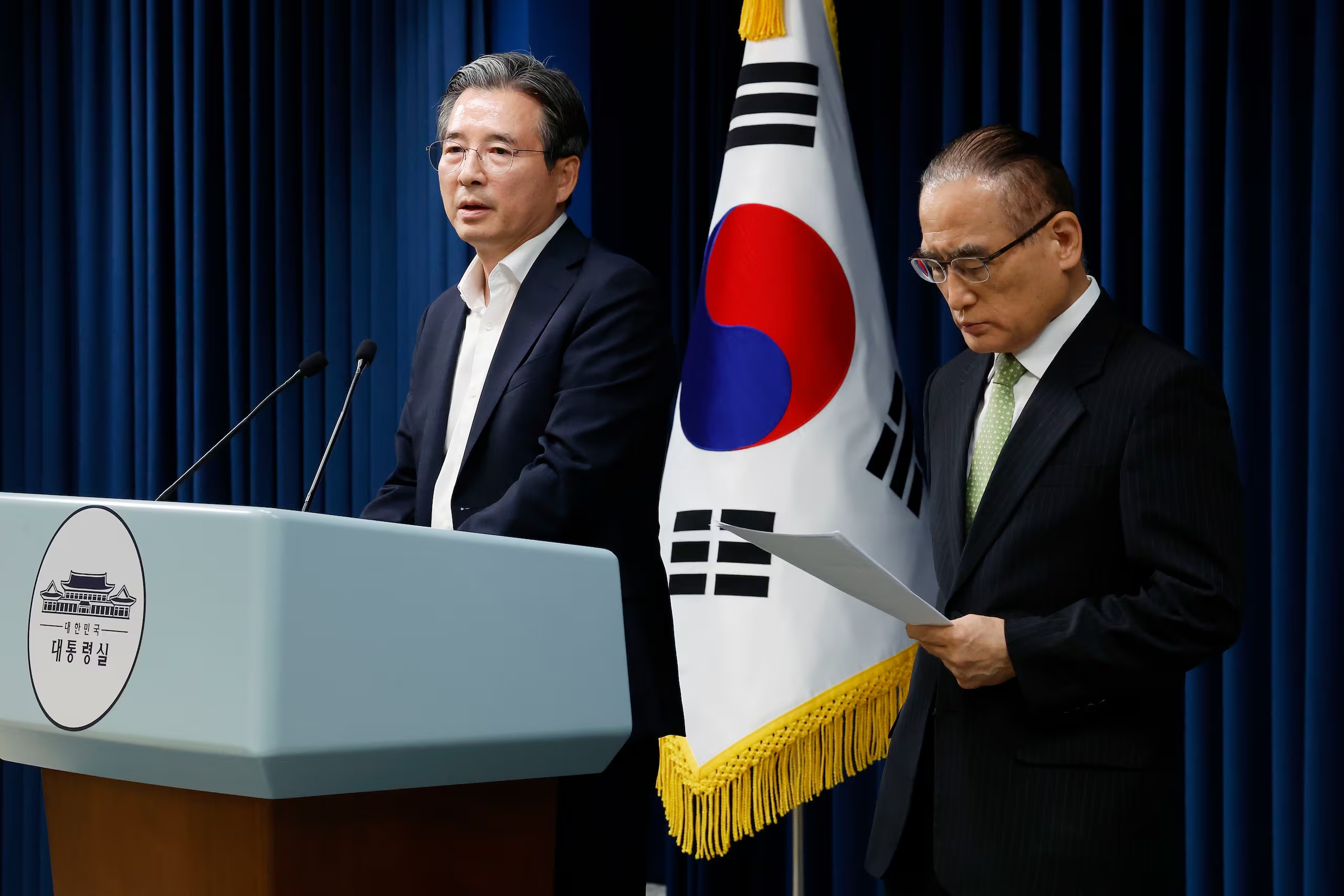 ↑2025年07月25日、大統領室が交渉に当たった魏聖洛(ウィ・ソンラク)国家安保室長を伴ってブリーフィングを行っているところ。
