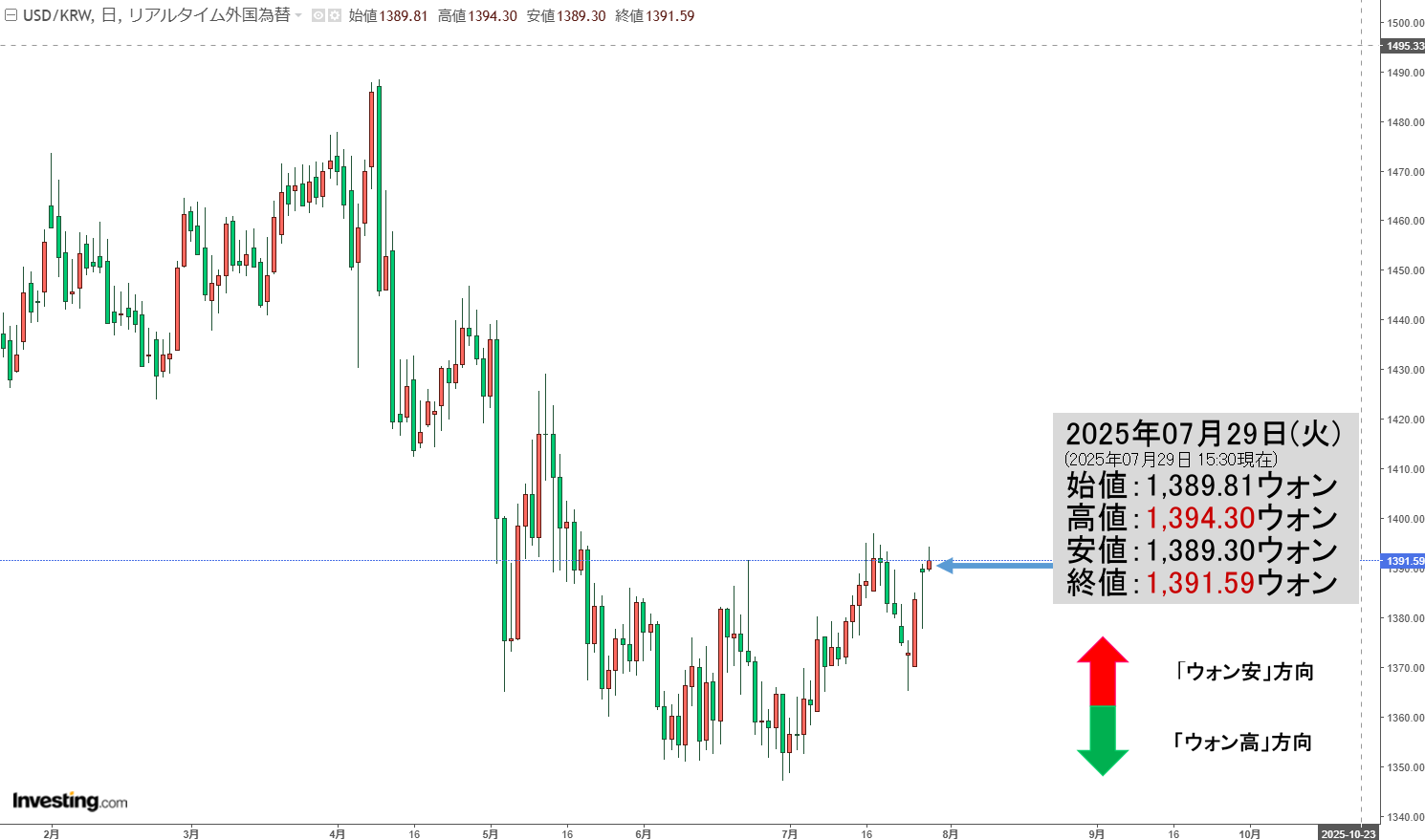 2025年07月30日(水)の市場が開きました。10:00現在、ドルウォンのチャートは以下のようになっています(チャートは『Investing.com』より引用)。前日は陽線となりましたが、本日は陰線が伸びています。現在のところ「1ドル=1...
