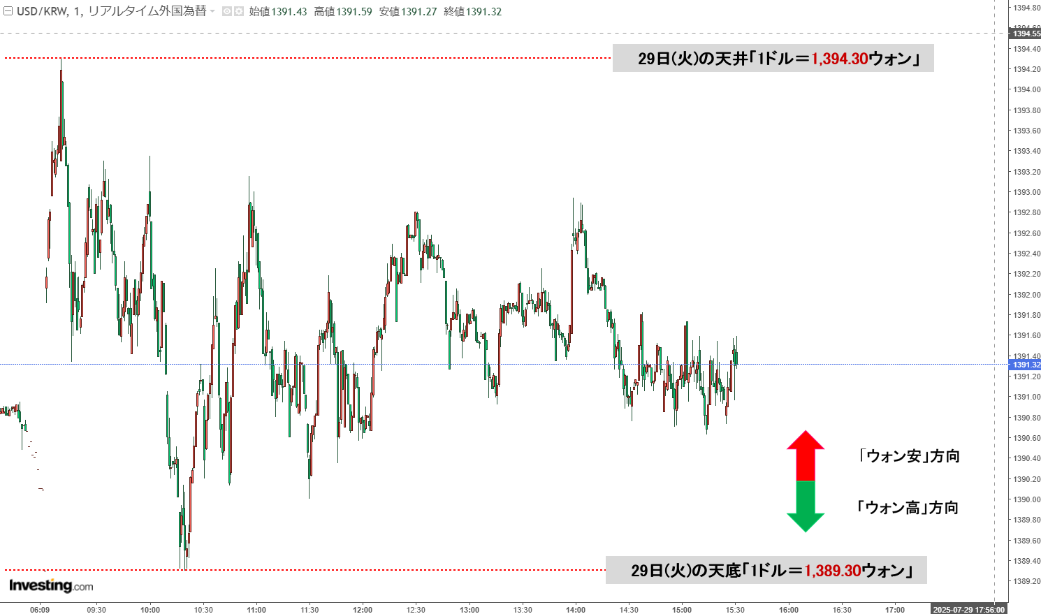 2025年07月29日(火)15:30現在、ドルウォンのチャートは以下のようになっています(チャートは『Investing.com』より引用)。