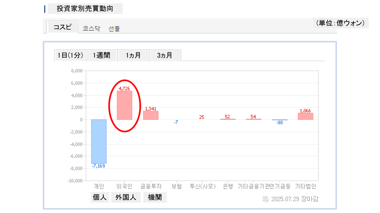 個人投資家は「7,169億ウォン」の売り越し。一方の外国人投資家は「4,726億ウォン」の買い越しです。