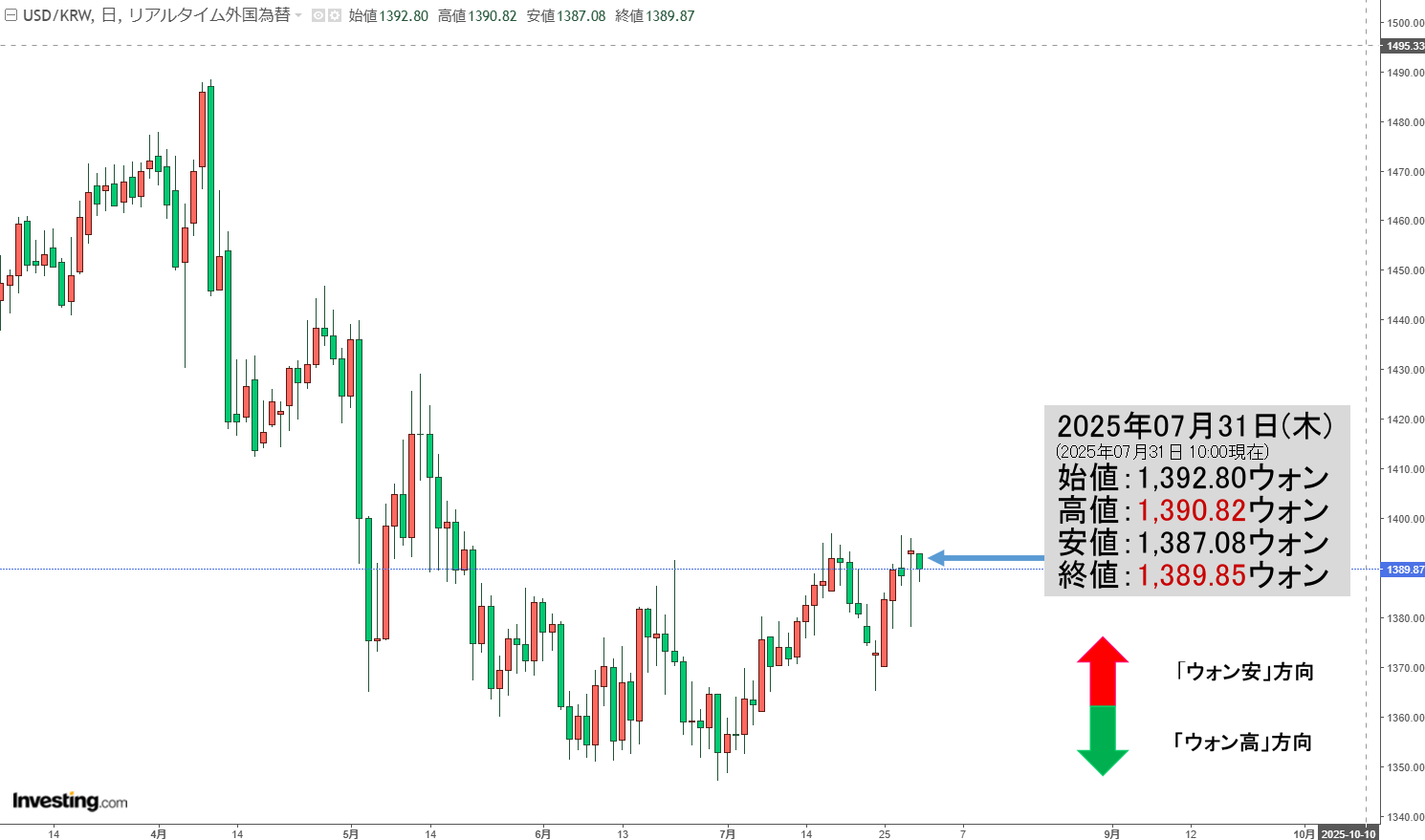 2025年07月31日(木)15:30現在、ドルウォンのチャートは以下のようになっています(チャートは『Investing.com』より引用)。陰線が伸びて、現在のところ「1ドル=1,388ウォン」近辺の攻防となっています。ローソク足1本が...